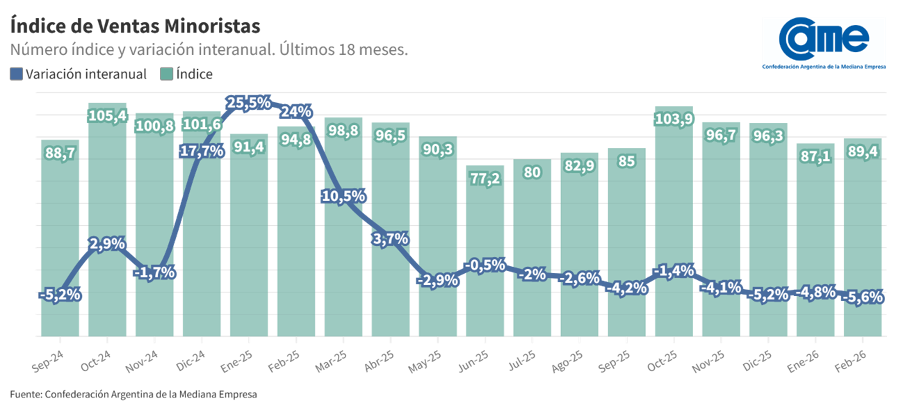Registró en febrero de 2026 una caída del 1,9% en comparación con el mismo mes del año anterior, según datos privados. Estos son los datos del consumo privado en Argentina registró en febrero de 2026 una caída del 1,9% en comparación con el mismo mes del año anterior, según datos privados.